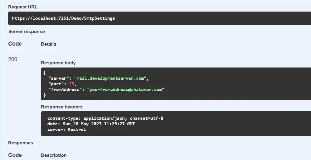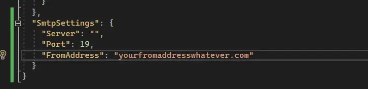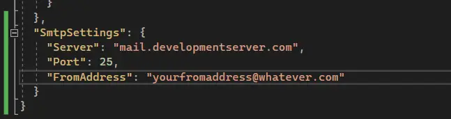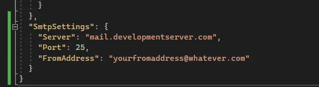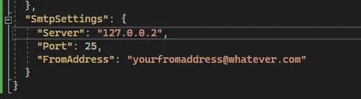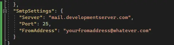 Now, let's modify the "appsettings.Development.json" file and populate the SMTP settings with in-correct values.