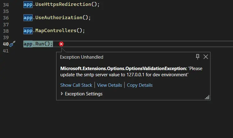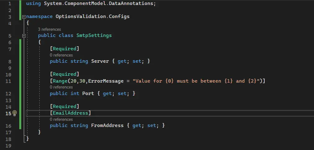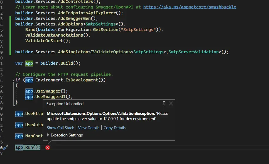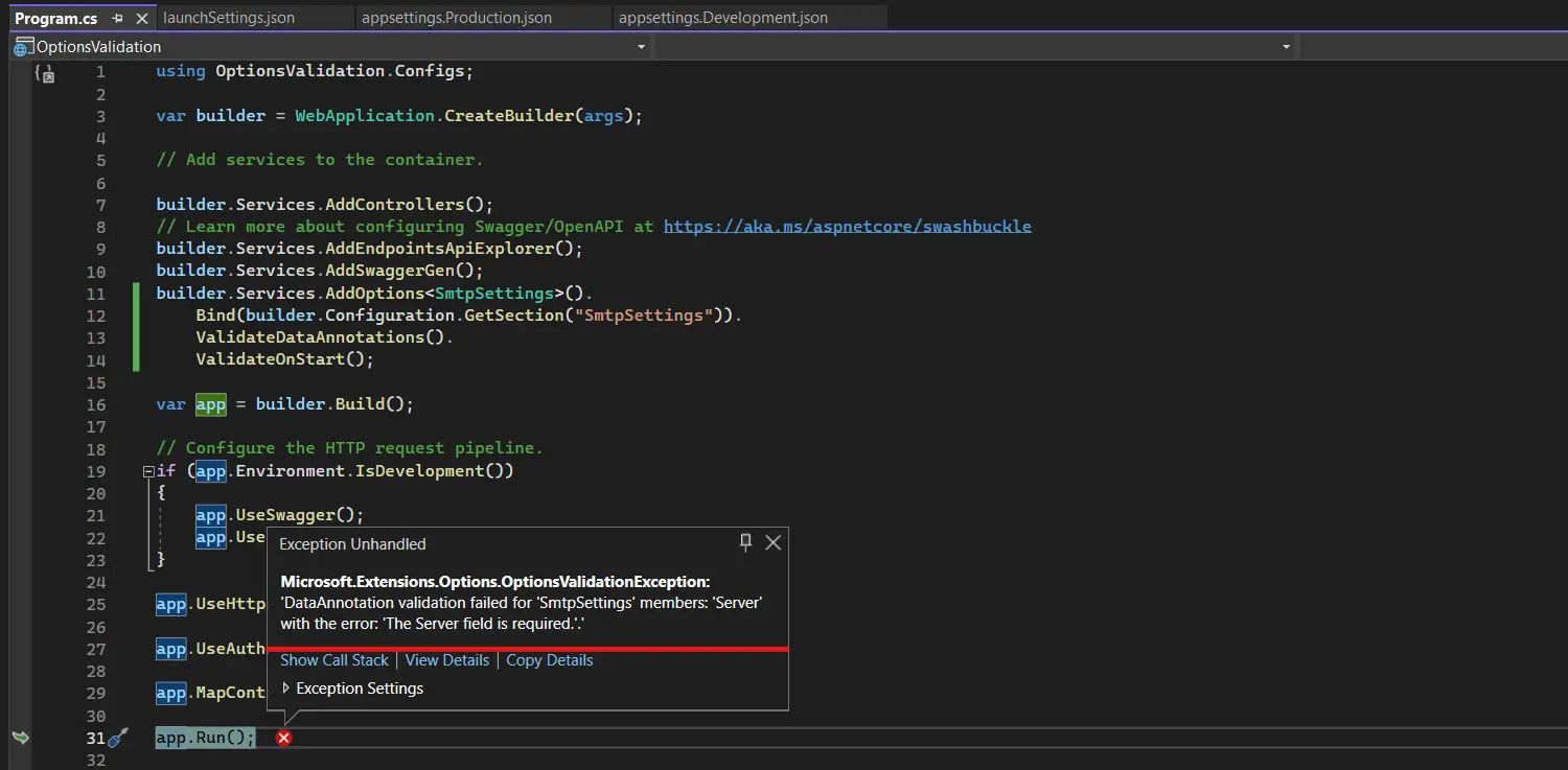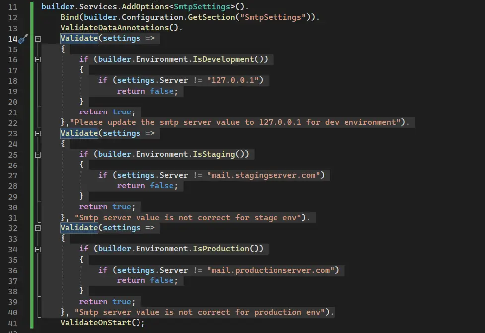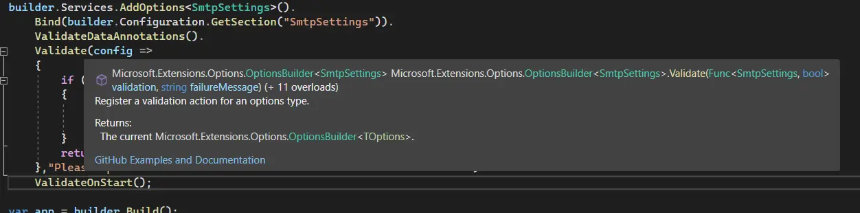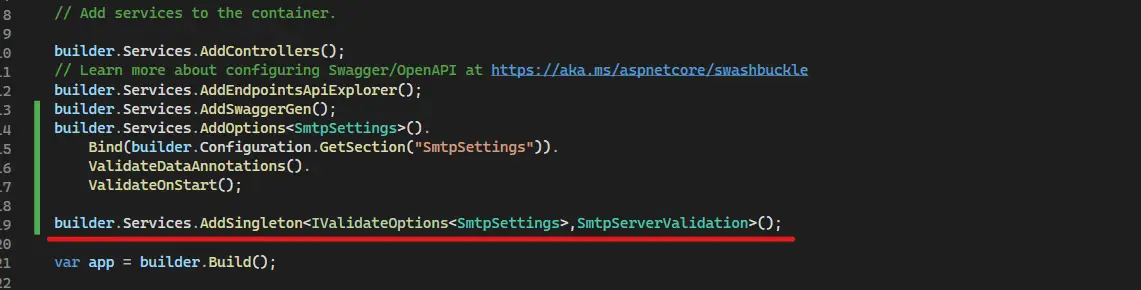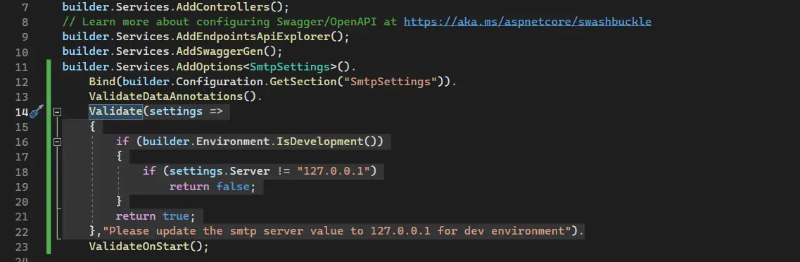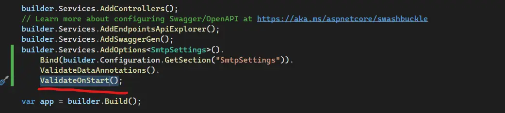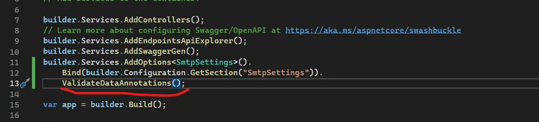 We have incorporated DataAnnotation attributes to the "SmtpSettings" POCO class for validation purposes. To trigger the validation, we need to chain the "ValidationDataAnnotation()" method in the "Program.cs" file, as shown in the image below: