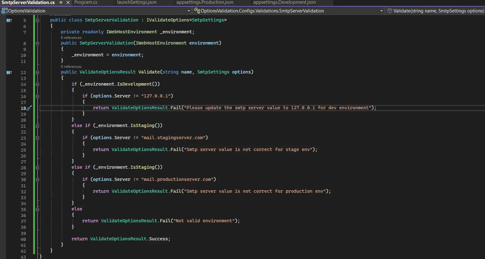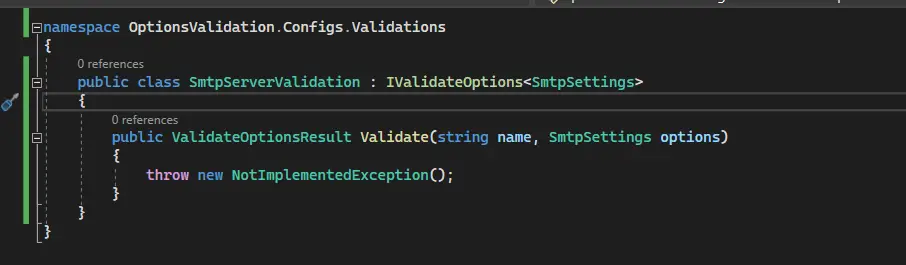 As shown in the image above, the SmtpServerValidation class inherits the IValidationOptions inter-face, which requires the implementation of the Validate method.