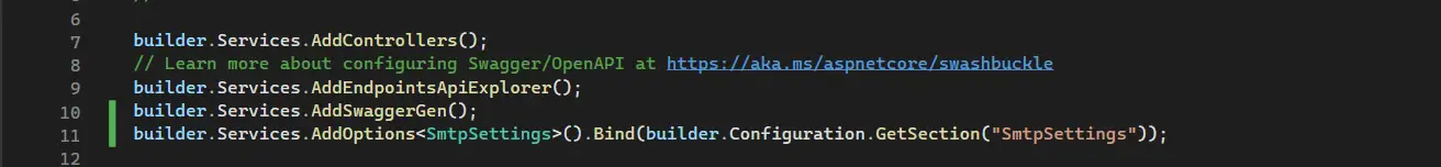 In the "Program.cs" file, all of these settings are bound to the "SmtpSettings" class at line number 11 (refer to the image below):