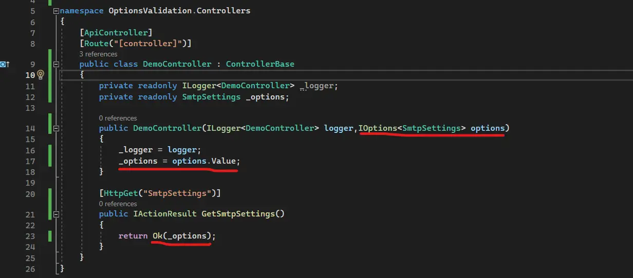 In one of the controllers, these options are injected, and there is an endpoint that simply returns the options value in the response.