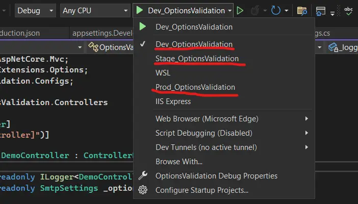 Additionally, we have the flexibility to change the environment and load specific appsettings accord-ing to the chosen environment.