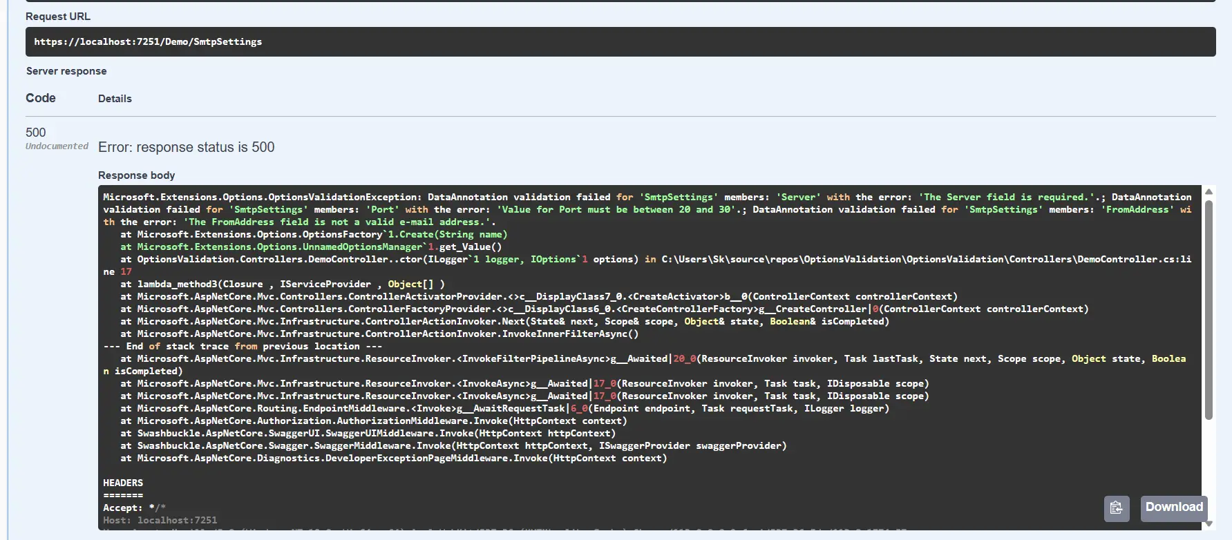 After making incorrect changes to the "appsettings.Development.json" file, running the project with the development environment, and executing the endpoint, it should generate a validation error similar to the image above.