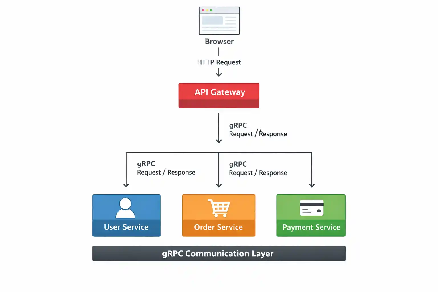 User Service, Order Service, and Payment Service process the request and return a gRPC response back to the API Gateway.