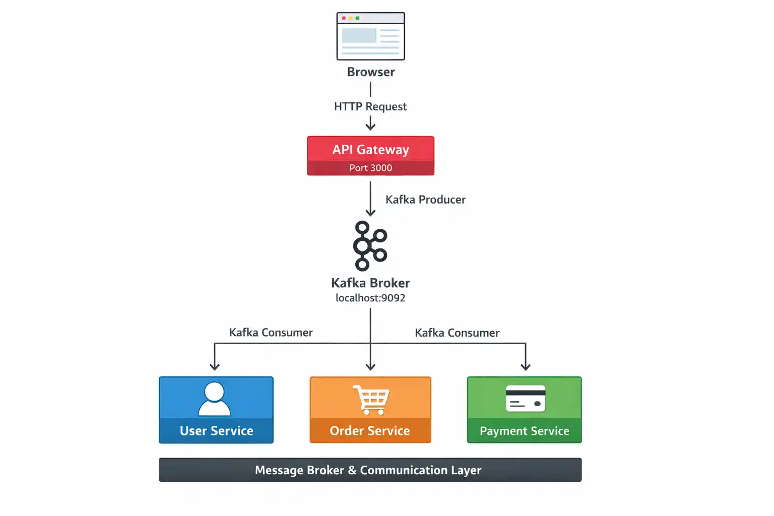 4. User Service, Order Service, and Payment Service act as Kafka consumers, process the messages, and send responses back through Kafka.